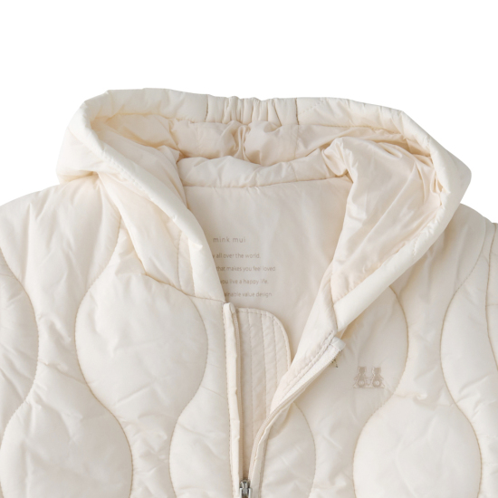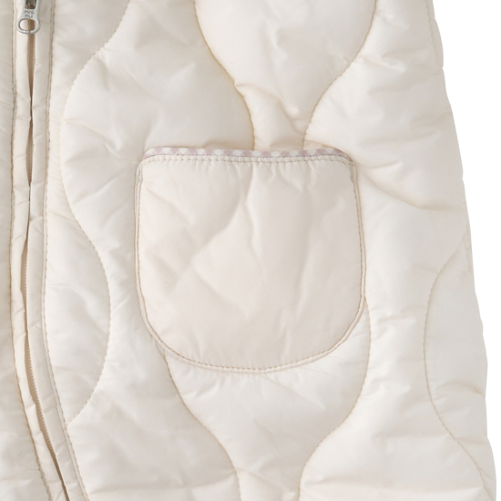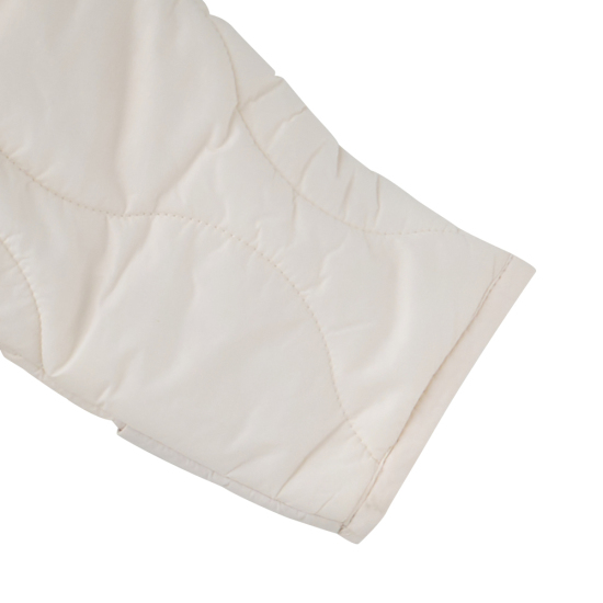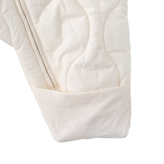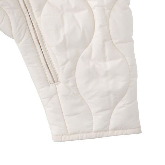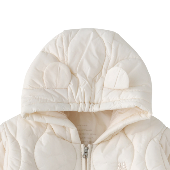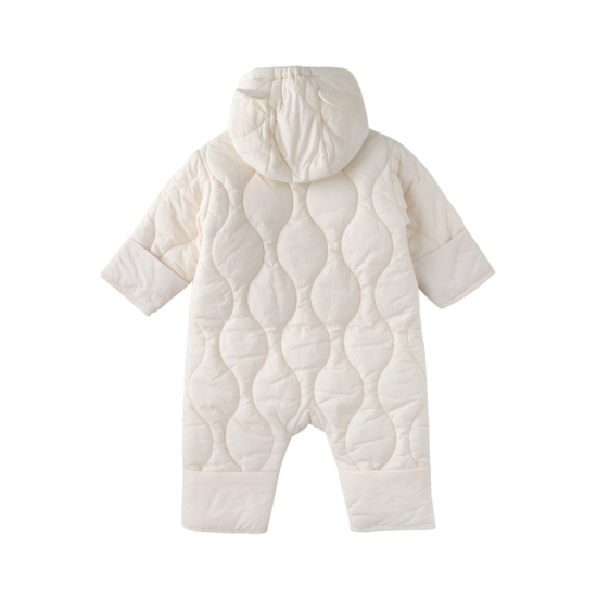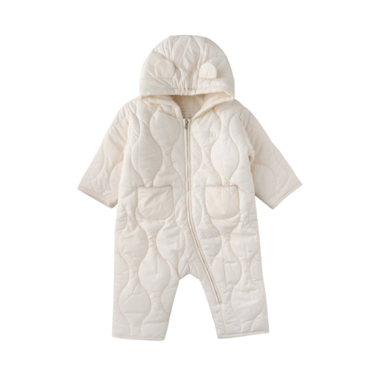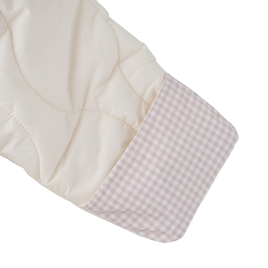 베이직한 아이보리 컬러의 패딩 아우터 우주복입니다. 부드러운 화섬 소재에 포근한 충전재를 넣어 가볍지만 보온성이 좋으며 손싸개 부분에 배색 체크 패턴으로 포인트를 주어 귀여움을 더한 아이템입니다.