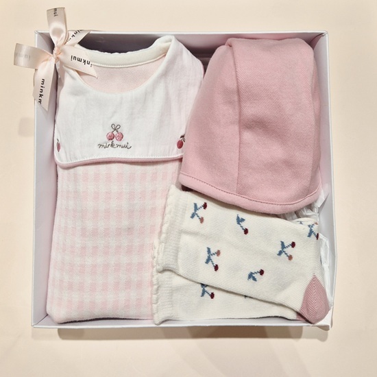 앞 여밈이 전체적으로 트여 있어 착용하기 편한 기본 바디슈트와 모자,양말 세 트 아이템입니다.