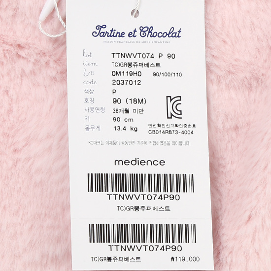 (롯데백화점)봉쥬퍼베스트 TTNWVT074P(유아퍼조끼)