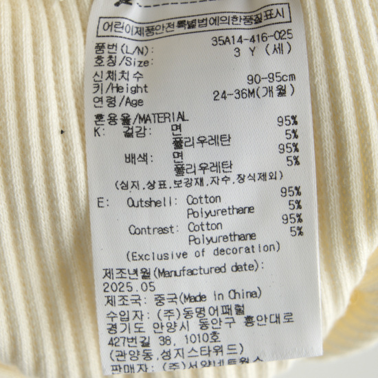 소 재.......겉감-면95%,폴리우레탄5% / 배색-면95%,폴 리우레탄5%