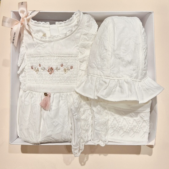부드러운 플라워 자가드 소재에 프릴 소매를 매치하여 사랑스러움을 더했으며 은은한 플라워 자수로 포인트를 주었습니다.