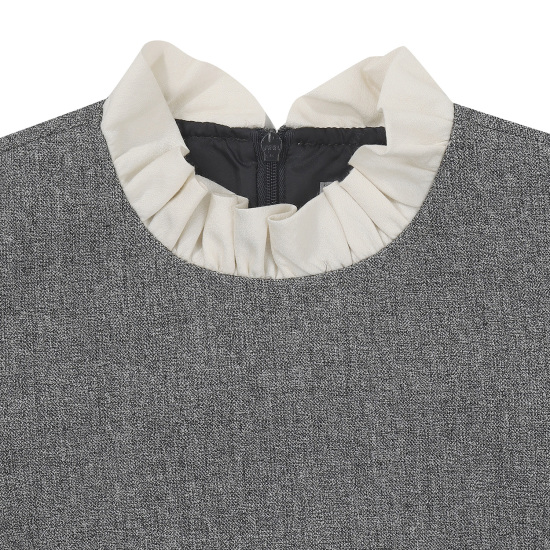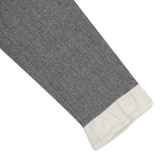 고급스러운 투톤 그레이 컬러의 원피스입니다. 유니크한 소재를 사용하여 스커트의 풍부한 셔링이 부담스럽지 않으며 다양한 체형을 커버해 줄 수 있는 실루엣이 세련된 디자인입니다. 사랑스러운 카라 러플과 손매끝의 배색이 포인트로 화사한 이미지를 더해줍니다.