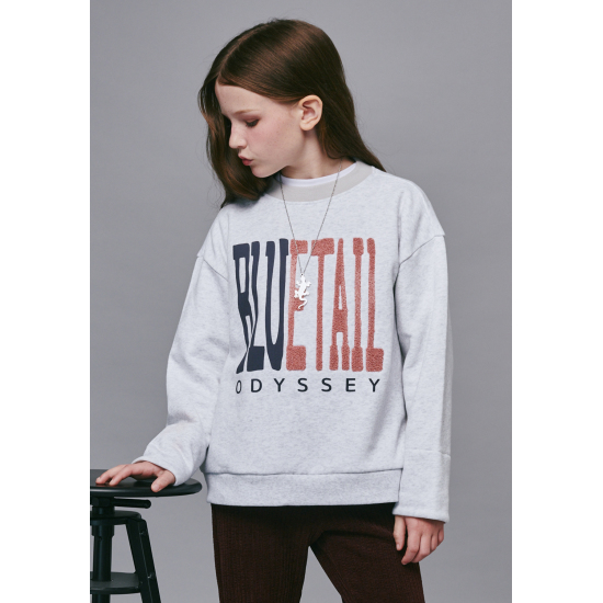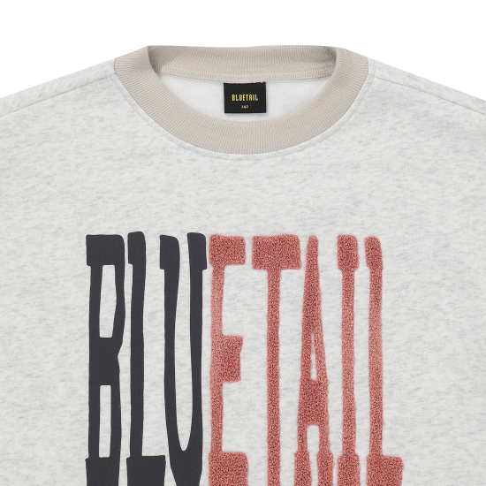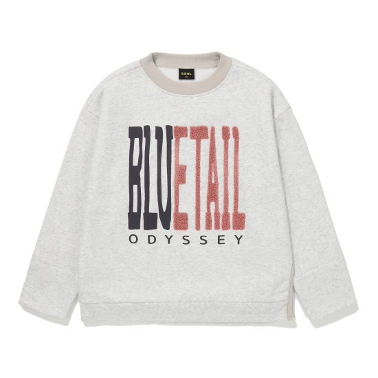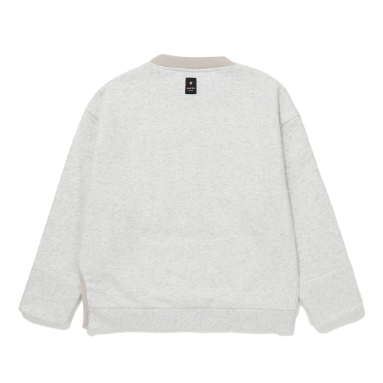 한쪽 사이드에 깊은 슬릿 디테일이 들어간 라이트 그레이 맨투맨입니다. 넥과 둥근 슬릿을 감싼 바인딩 원단에 배색을 사용해 따뜻한 무드를 주었습니다. 소매 안쪽에도 배색을 사용해 접어서 스타일링하기에도 좋은 상품입니다. 중앙에 큼직하고 스포티한 로고 레터링으로 브랜드 Identity를 표현했습니다.