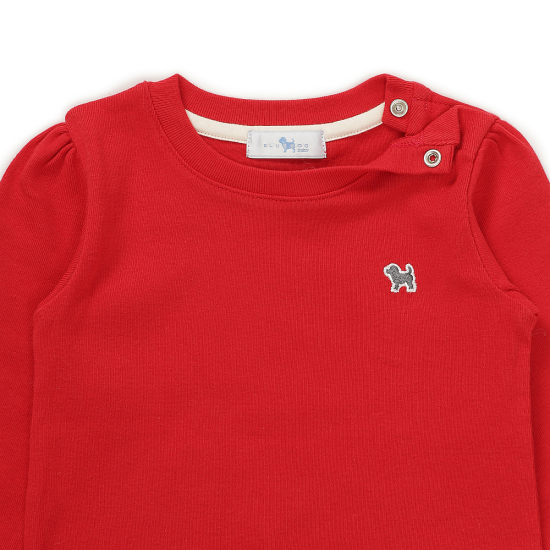 레드컬러 티셔츠와 퀼팅 소재 원피스 구성의 세트형 원피스 입니다.