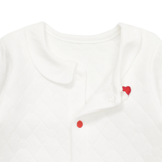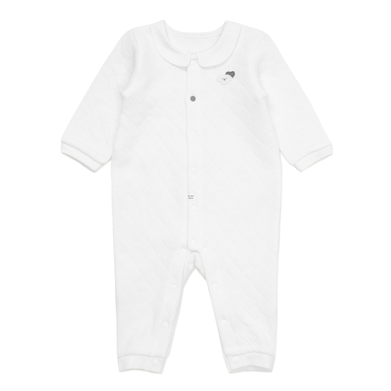 WARM COTTON 라인의 우주복입니다. 면모달 삼중지 퀼팅소재를 사용하여 촉감이 부드럽고 흡습성이 좋으며, 원단사이의 공기층이 아이의 체온을 유지 시 켜줍니다. 카라스타일로 외출복으로도 손색 없으며 선물용으로 추천하는 아이템 입니다. 구름강아지 자수로 포 인트를 주었습니다.
