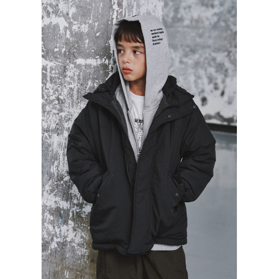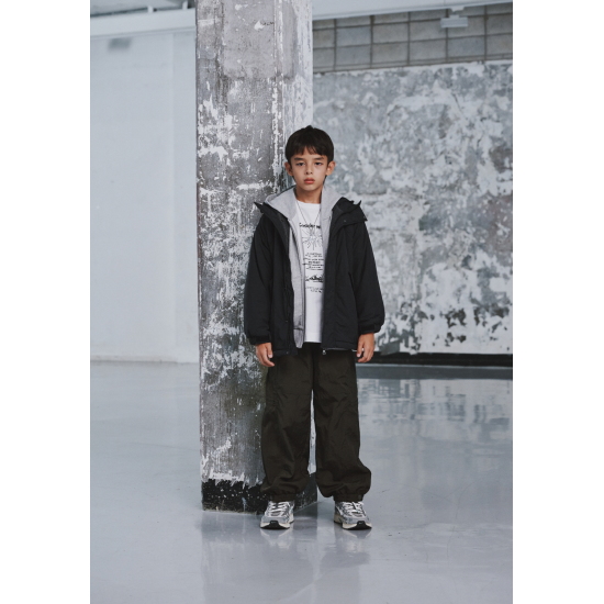 고시감 있는 나일론 겉원단에 플리스 안감으로 높은 보온성과 양면으로 입을 수 있는 리버시블 블랙 화섬 점퍼입니다. 아웃도어스러운 느낌으로 세련된 고프코어룩을 연출할 수 있습니다. 겉쪽 화섬은 야상을 미니멀하게 해석한 시크함이 돋보이고, 안쪽 플리스는 포근함을 살려 미니멀하게 제안하였습니다. 힙을 넉넉하게 덮는 기장에 밑단과 허리 안 엘라스트링으로 프로텍티브한 핏을 연출할 수 있습니다. 세련된 가죽 라벨과 레터링 자수로 컬러 포인트를 주었습니다.