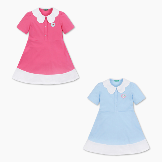 물결 카라 디테일과 러블리한 하트 와펜으로 포인트를 준 원피스.