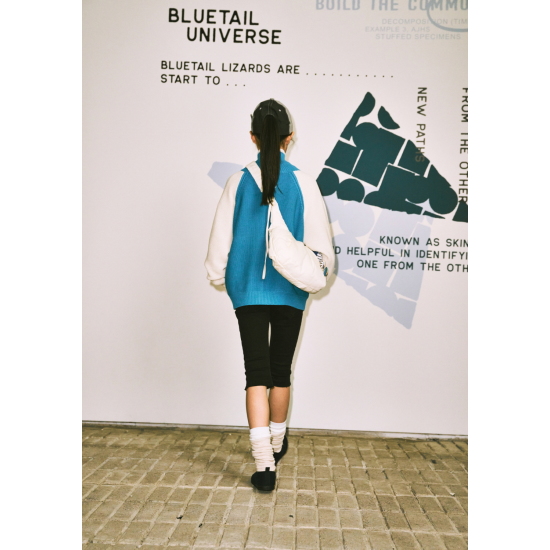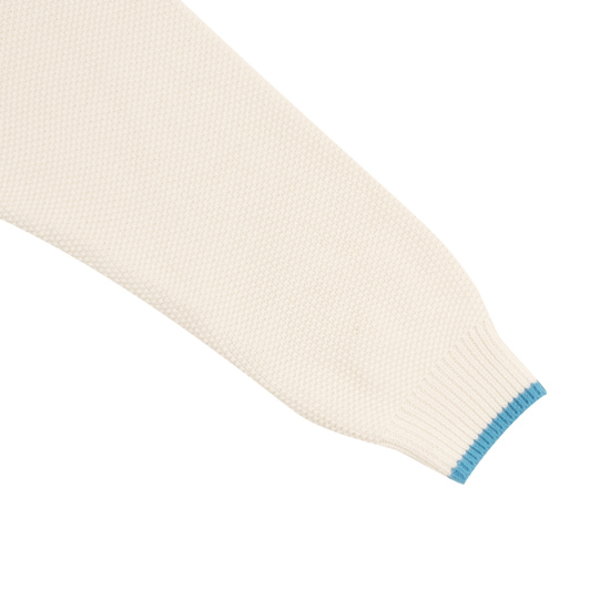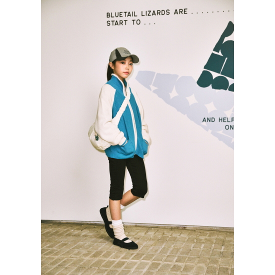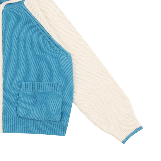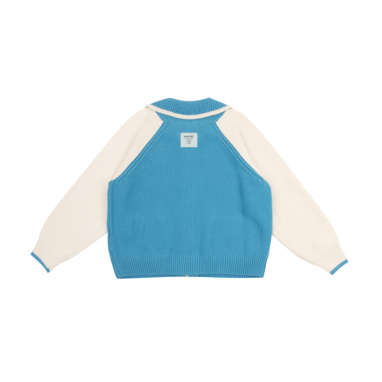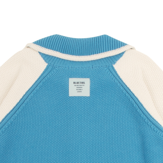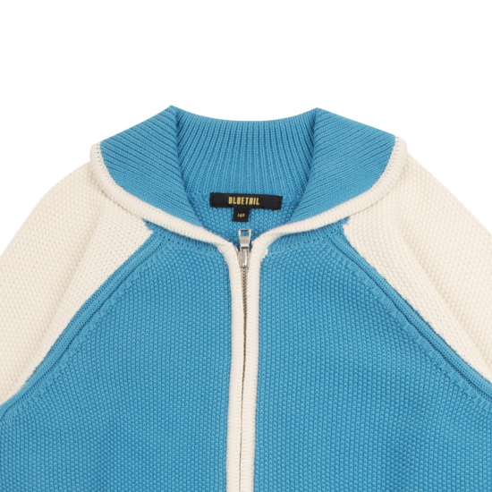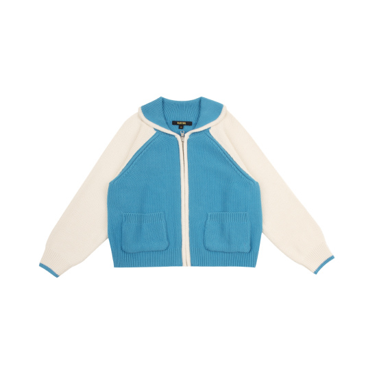 라운딩 카라에 크롭한 기장으로 제안한 아쿠아블루 컬러의 니트 집업 가디건입니다. 래글런 배색 소매과 랍빠로 배색 효과를 주어 스포티한 느낌을 연출합니다. 변형 벌집 조직으로 입체적인 조직감을 주었습니다.