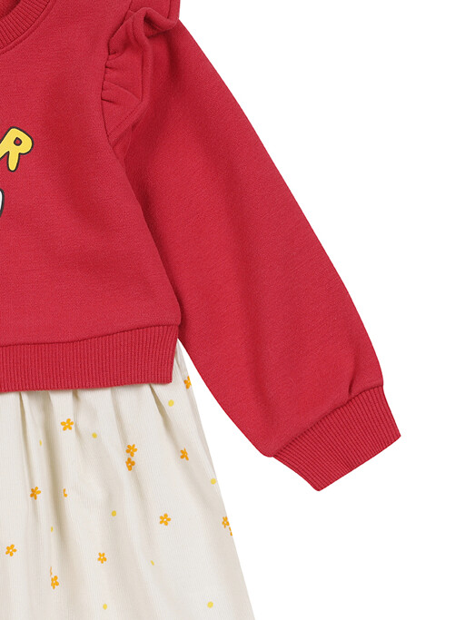 2. 밑단 스커트는 전판프린트가 들어간 우븐 코듀로이 소재를 매칭하여 레이어드로 입은 듯한 연출이 가능 ;