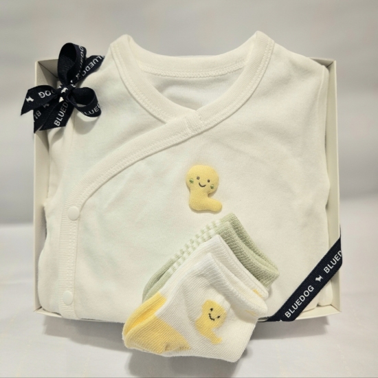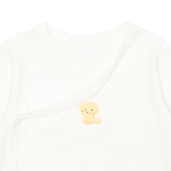COZY COTTON라인의 배내바디수트캐릭터양말SET입니다. 터치감이 좋은 80수 양면 소재를 사용하여 피부가 약한 아이들에게 추천하는 아이템 입 니다. 뱀 캐릭터 비비인형으로 포인트를 주었습니다..출산선물로 용이한 상품입니다.