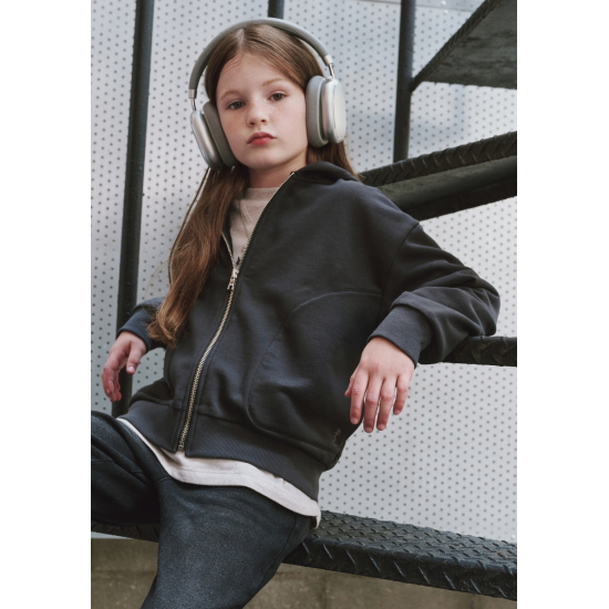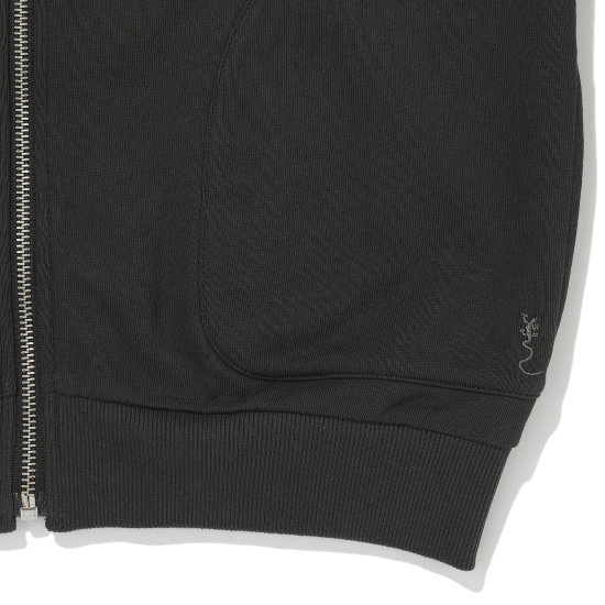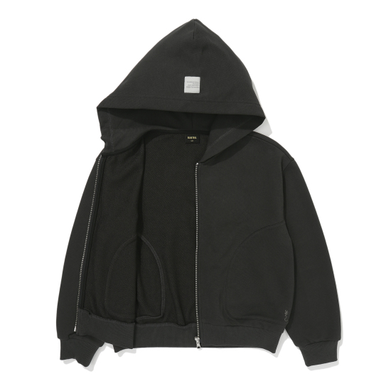 힙하고 트렌디하게 연출할 수 있는 크롭 후디 차콜그레이 집업점퍼입니다. 앞뒤로 라운딩된 절개로 포인트를 준 아이템입니다. 도마뱀 자수와 라벨로 컬러 포인트를 주었습니다.
