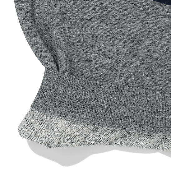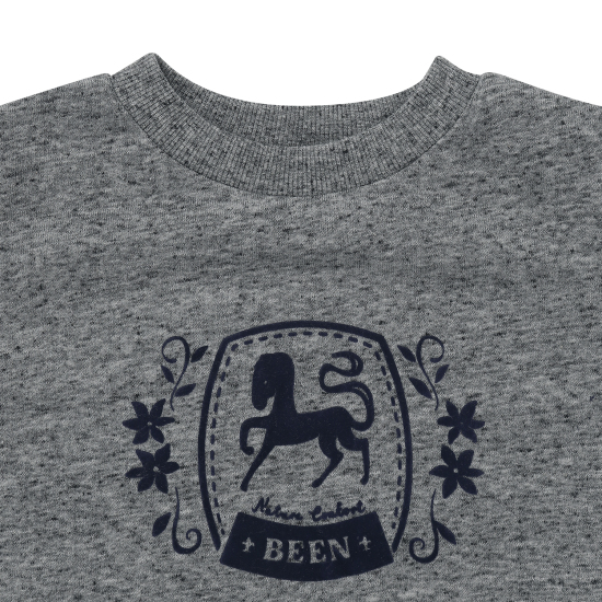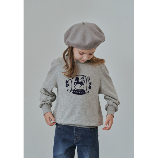 그레이 컬러의 라운드 네크라인 맨투맨 티셔츠입니다. 몸에 적당히 잘 맞는 실루엣으로 소매 부분에 살짝 셔링을 주어 편안하고 여성스러운 분위기를 연출합니다. 선명한 네이비 컬러의 승마클럽의 포인트가 럭셔리하며, 가을 시즌에 스마트한 이미지를 더해줍니다. 여아 와이드 블루 데님과 함께 코디하여 세련된 스타일링을 연출할 수 있습니다.