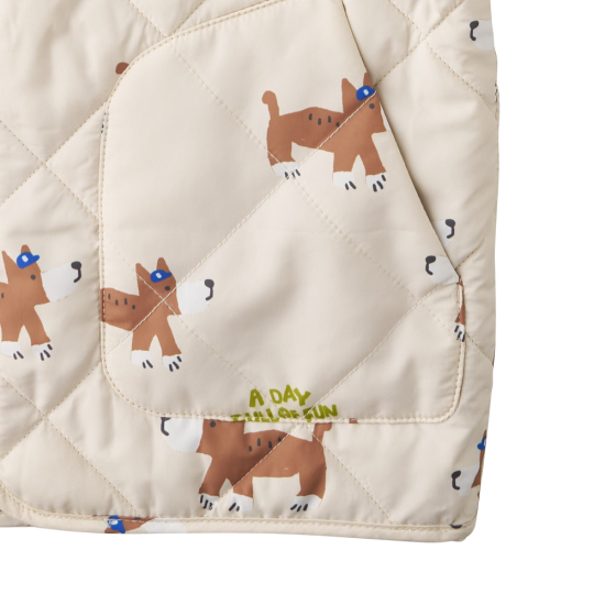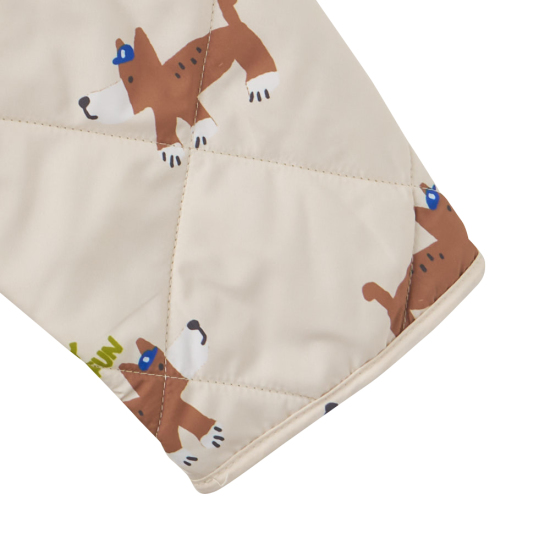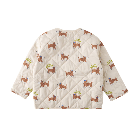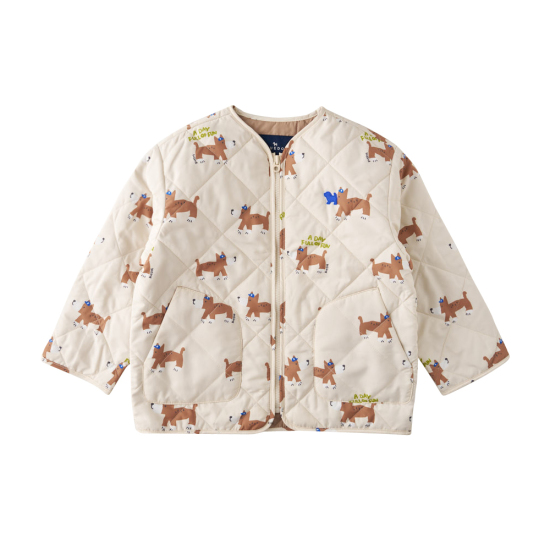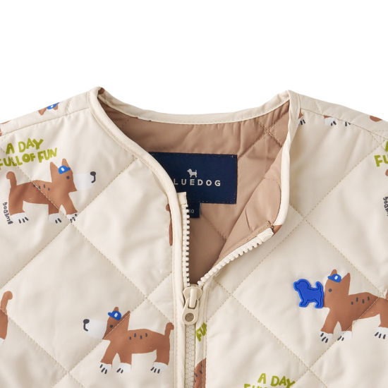 내구성이 좋은 화섬 소재를 사용하였고 귀여운 강아지 프린트와 큼직한 사각퀼팅으로 캐주얼한 무드를 더한 패딩 충전재로 초겨울까지 착용가능한 두께감이며 귀엽고 트랜드하게 착용가능한 아이템입니다