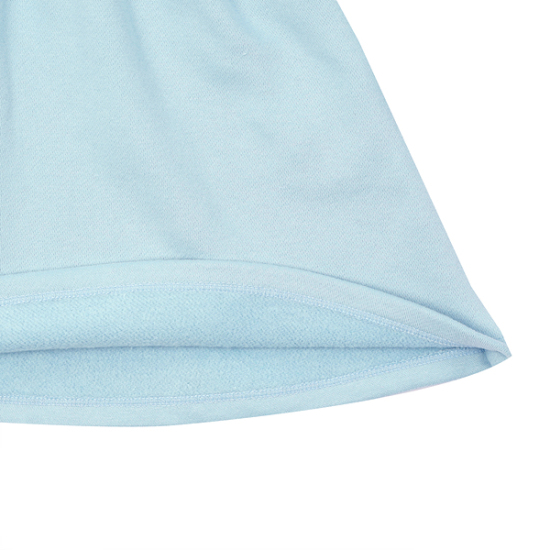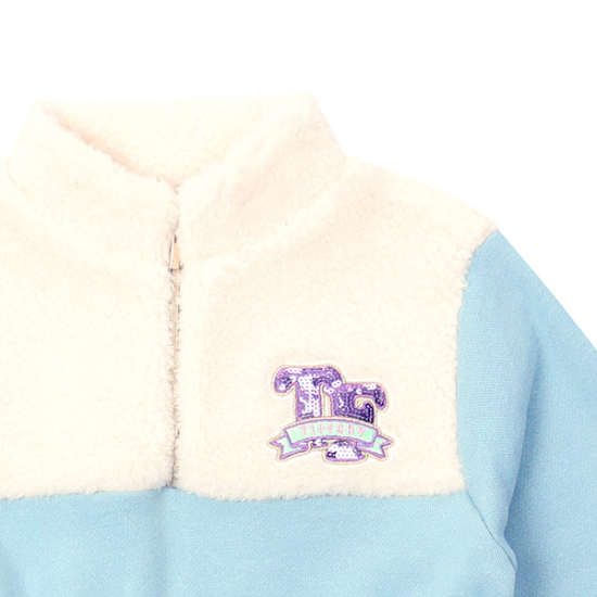 상품설명-넥라인을 반집업 형태로 디자인하여 캐주얼함을 더한 A라인 원피스입니다. 허리부분에 고무줄을 넣어 활동이 편하도록 디자인했습니다. 시어링 소재를 아이보리 배색으로 사용하여 보온성을 더하였습니다. 원피스 상단의 스팽글을 활용한 와펜 포인트는 발랄한 느낌을 줍니다. 연블루와 연보라(T35KKO010) 두 칼라로 구성되어있습니다.