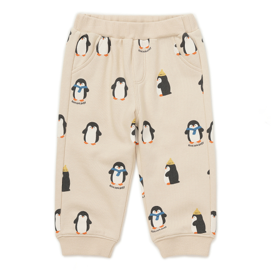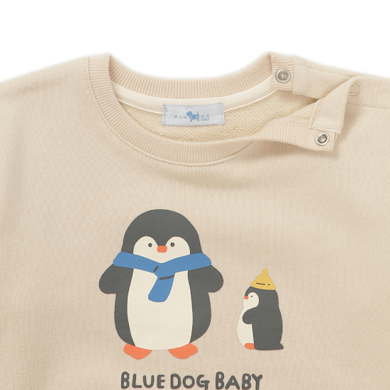 목도리와 비니를 쓴 펭귄이 믹스된 패턴으로 귀여움을 더했고 겨울 시즌 등원룩으로 활용하기 좋은 아이템 입니다.