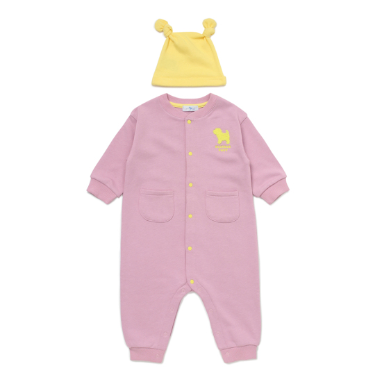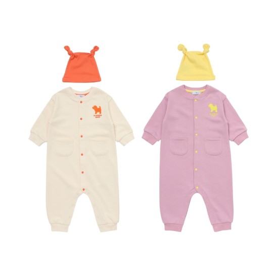 베이직한 블루독베이비 로고가 포인트인 우주복 세트 아이템입니다.면 소재를 사용한 우주복으로 톤다운 된 퍼플 컬러 위에 에쉬