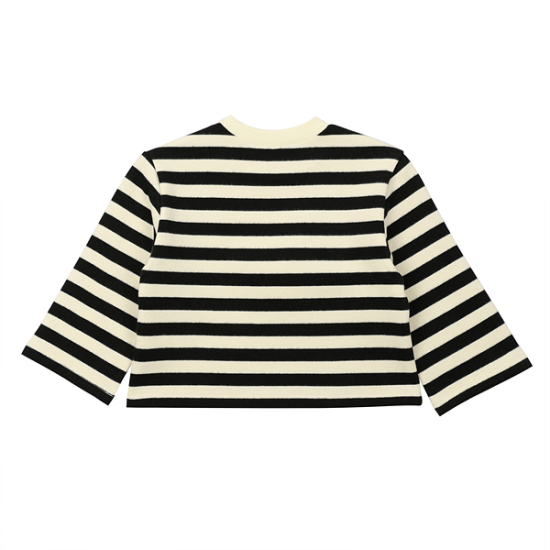 상세설명-스트라이프 기모쭈리 소재 크롭티로 앞넥라인에 장식 카라가 덧대어진 스타일입니다. 짧은 기장감으로 부츠컷 팬츠나 스커트에 코디하여 연출하기 좋은 티셔츠입니다. 골드 리본 브롯치 장식이 있습니다.