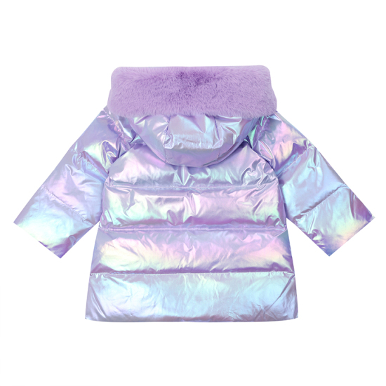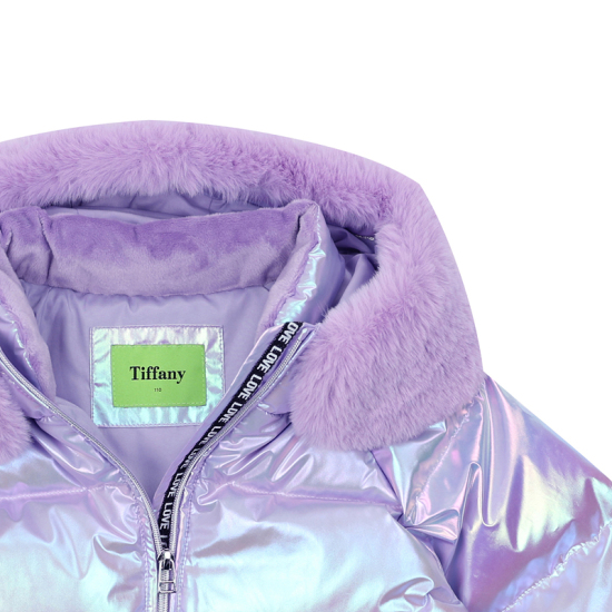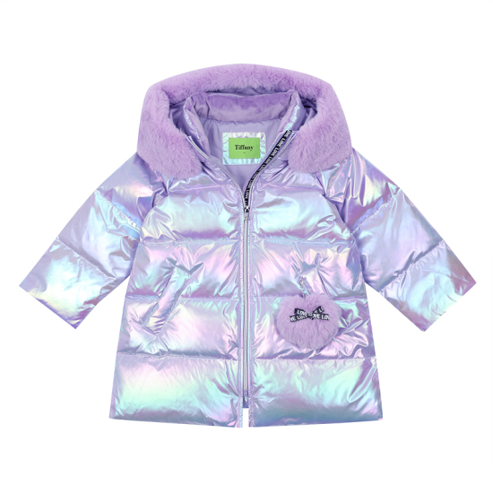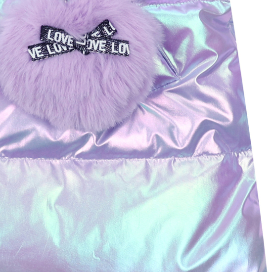 상품설명-보라 샤이닝 소재 오리털 점퍼로 중힙 기장으로 박시한 스타일의 점퍼입니다. 후드 스타일로 후드 끝 털 부분을 탈착으로 해서 착용하는 스타일입니다. 앞 지퍼 플라켓과 소매 밑단에 로고 TAPE 장식으로 포인트를 주고 포켓 라인에 하트 라본 퍼 장식이 달려 있어 귀여운 포인트를 살린 점퍼입니다.