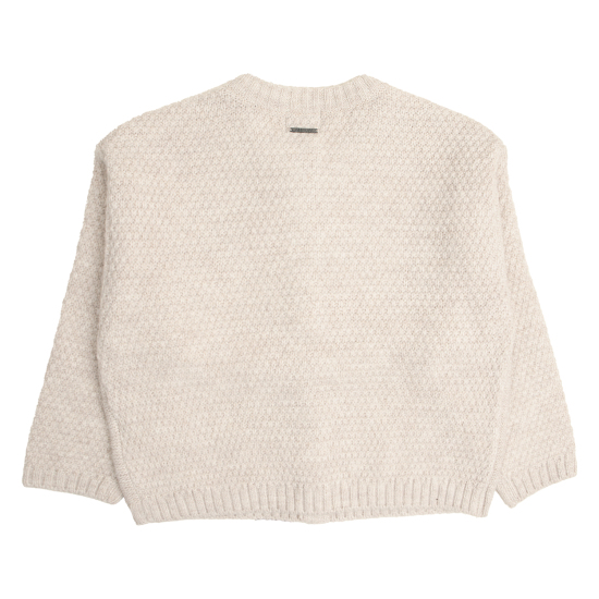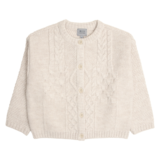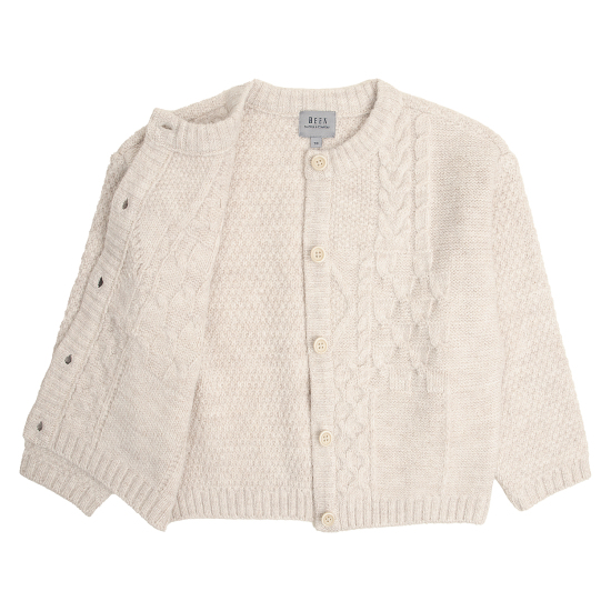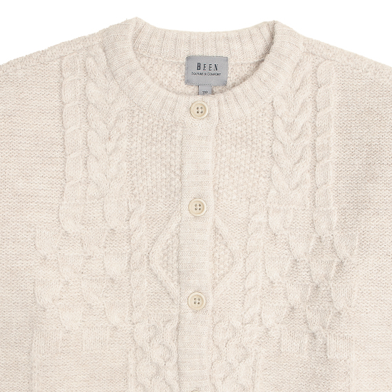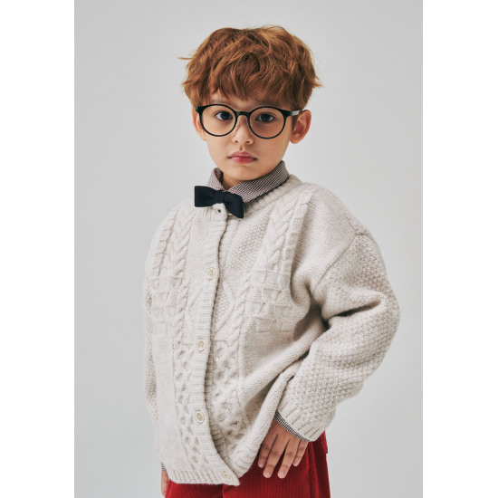 뉴트럴한 라이트 베이지 컬러가 부드럽고 세련된 이미지를 연출해주는 니트 가디건입니다. 케이블과 다양한 조직들이 변형된 디자인으로 유니크한 이미지를 더해주며, 남아는 다이마루 화이트 셔츠, 나비 보우타이를 함께 코디하고 블랙 와이드 팬츠 또는 코듀로이 팬츠 블랙 다운 점퍼와 함께 따뜻한 겨울 타운 스타일링을 제안할 수 있습니다.