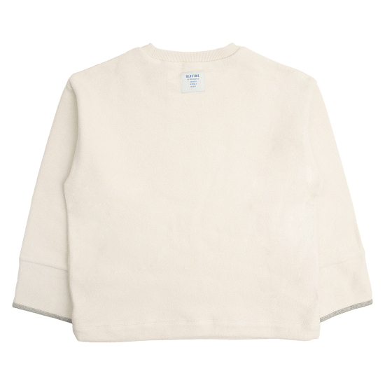 부드럽고 따뜻한 기모 소재의 아이보리 컬러의 유니크한 오버핏 티셔츠입니다. 몸판 전체는 주원단 뒷바닥 기모를 보이게 사용해 따뜻함을 느낄 수 있고 소매 안쪽에 배색을 사용해 접어서 스타일링하기에도 좋은 상품입니다. 앞판에는 톤온톤 원단 패치와 스카이블루 컬러 자수를 매치하여 따듯한 포인트를 주었습니다.