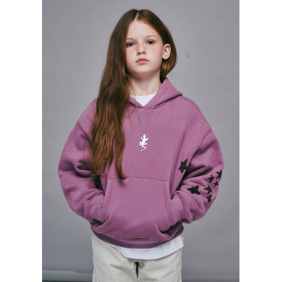 트렌디한 핑크 컬러가 매력적인 후드티셔츠입니다. 넉넉한 상동에 살짝 힙을 덮는 기장으로 제안하였습니다. 몸판 밑단과 소매밑단은 립으로 살짝 모아 약간의 볼륨감을 준 스타일입니다. 앞판과 소매에 빈티지한 별 나염을 스미듯이 모노톤 블랙 컬러로 제안하였습니다.