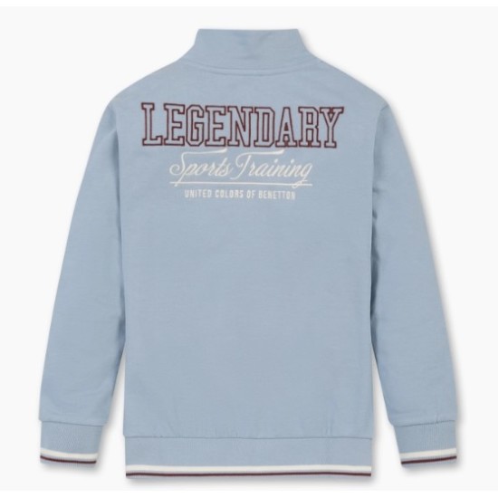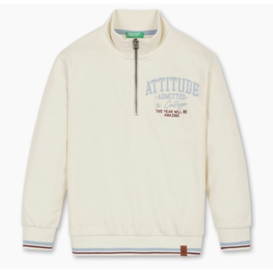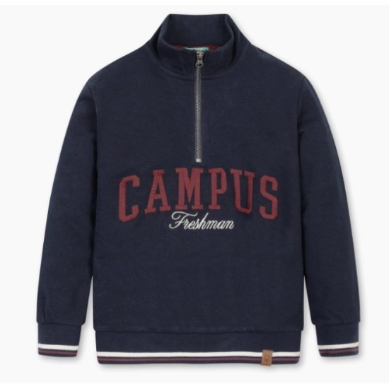레터링 자수 디테일이 돋보이는 반 집업 디자인의 맨투맨.
