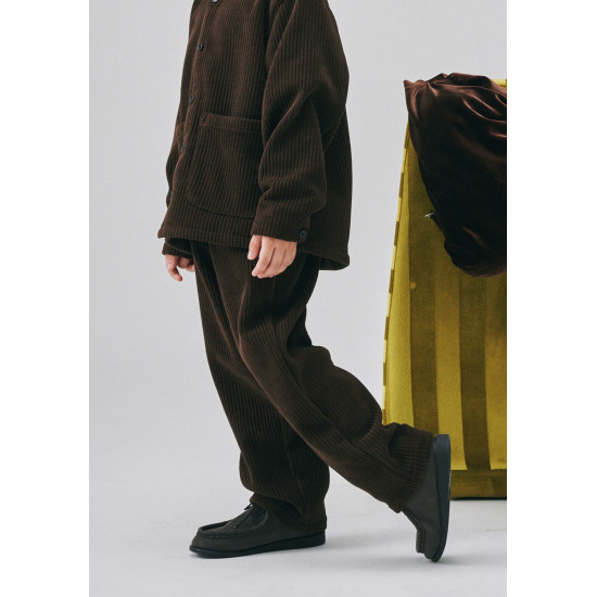 부드러운 골지 소재의 브라운 컬러 배기팬츠입니다. 코듀로이 소재를 져지 소재로 제안하여 부드럽게 떨어지는 촉감과 편안한 스타일링을 다양하게 제안할 수 있는 아이템입니다. 같은 소재의 셔츠 아이템과 셋업으로 제안하거나, 브라운 체크 셔츠를 이너로 입고 블루 컬러의 맨투맨 티셔츠와 함께 세련된 캐주얼룩으로 연출하여도 좋습니다.
