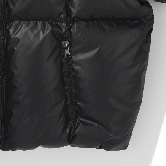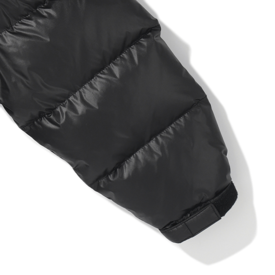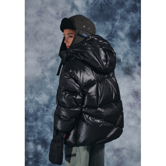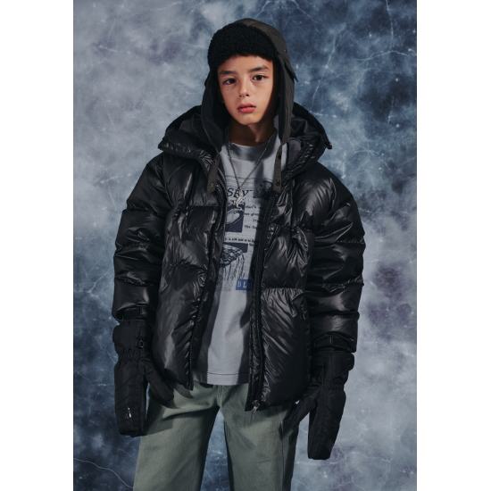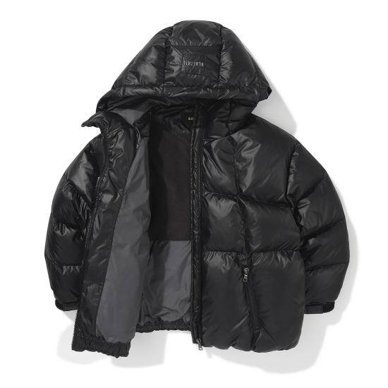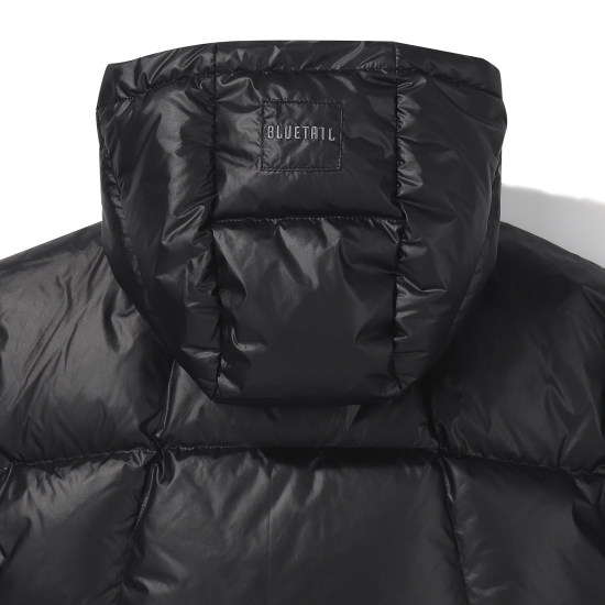 매트한 블랙 컬러의 후드 다운 점퍼입니다. 오리털(솜털80, 깃털20) 충전재로 보온성이 높으며 가벼운 착용감이 특징입니다. 밑단을 이밴드로 처리해 볼륨감 있는 디자인으로 제안했으며, 후드 입구와 밑단을 안쪽 엘라스트링으로 조여 둘레 조절이 가능하도록 제안했습니다. 안쪽 등은 플리스 배색을 사용해 보온성을 주었습니다. 스토퍼와 스트링, 안감을 세련된 컬러 조합을 사용했으며 컬러감 있는 테이프로 포인트를 더했습니다.