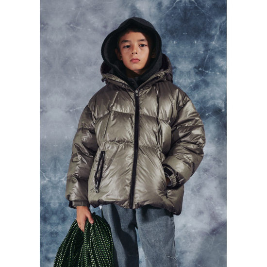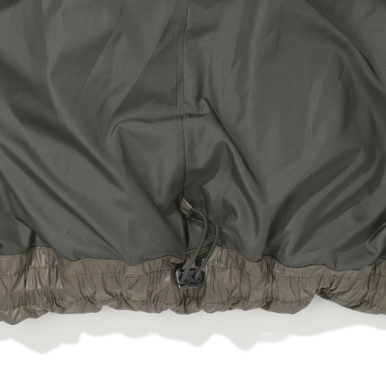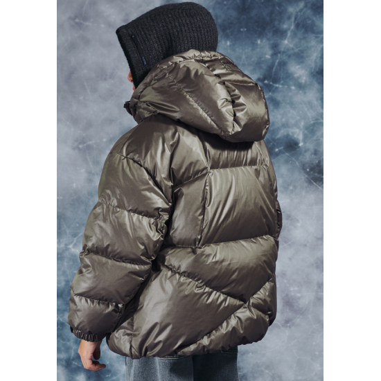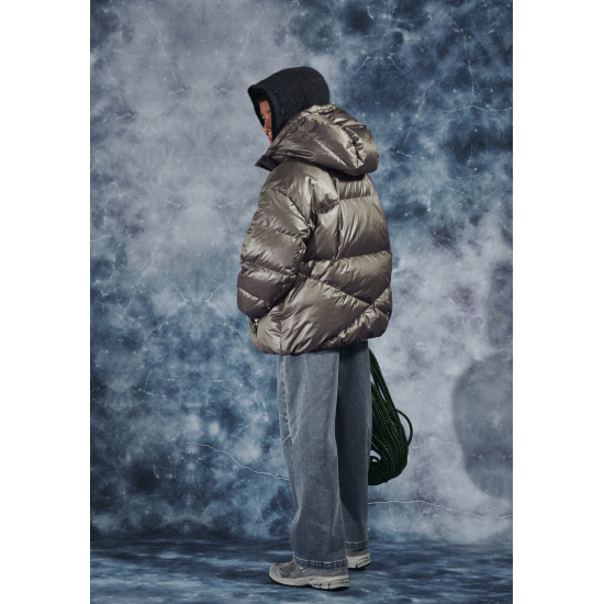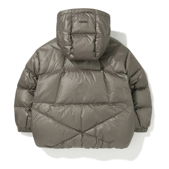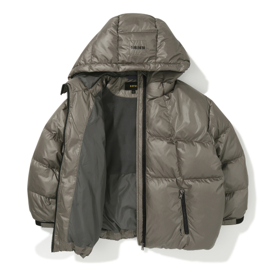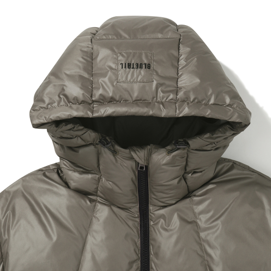 베이지 컬러의 후드 다운 점퍼입니다. 오리털(솜털80, 깃털20) 충전재로 보온성이 높으며 가벼운 착용감이 특징입니다. 밑단을 이밴드로 처리해 볼륨감 있는 디자인으로 제안했으며, 후드 입구와 밑단을 안쪽 엘라스트링으로 조여 둘레 조절이 가능하도록 제안했습니다. 안쪽 등은 플리스 배색을 사용해 보온성을 주었습니다. 스토퍼와 스트링, 안감을 세련된 컬러 조합을 사용했으며 컬러감 있는 테이프로 포인트를 더했습니다.