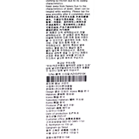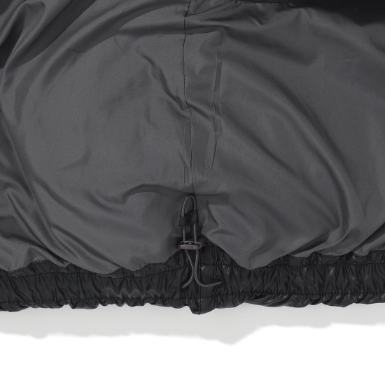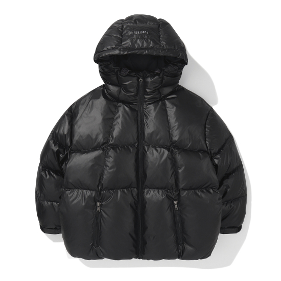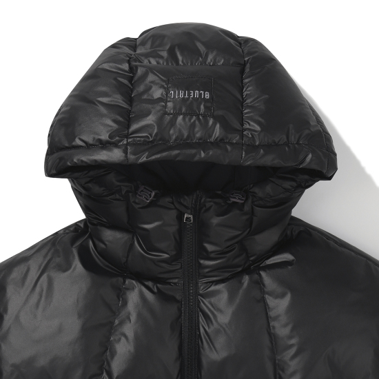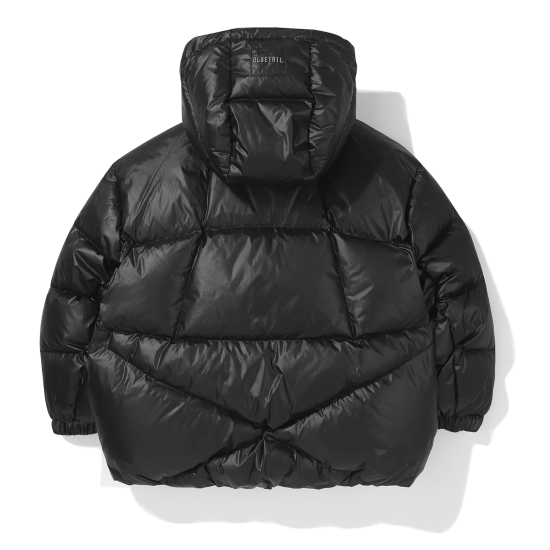 매트한 블랙 컬러의 후드 다운 점퍼입니다. 오리털(솜털80, 깃털20) 충전재로 보온성이 높으며 가벼운 착용감이 특징입니다. 밑단을 이밴드로 처리해 볼륨감 있는 디자인으로 제안했으며, 후드 입구와 밑단을 안쪽 엘라스트링으로 조여 둘레 조절이 가능하도록 제안했습니다. 안쪽 등은 플리스 배색을 사용해 보온성을 주었습니다. 스토퍼와 스트링, 안감을 세련된 컬러 조합을 사용했으며 컬러감 있는 테이프로 포인트를 더했습니다.