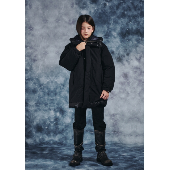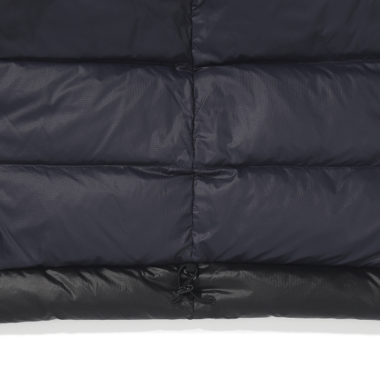 힘 있는 두께의 립스탑 원단으로 제안한 프로텍티브 야상 다운 점퍼입니다. 겉은 매트한 립스탑 블랙 화섬, 안쪽은 광택있고 가벼운 네이비 컬러 화섬으로 상반된 느낌이 시크함을 돋보이게 합니다. 허벅지 중간 정도 오는 미드 기장으로 제안하였고, 최소한의 절개와 스티치를 주어 미니멀하면서 프로텍티브한 아이템입니다. 넓고 긴 밸런스의 포켓이 포인트가 되는 스타일입니다. 후드 안쪽에 이중 카라로 볼륨감 있게 처리하였고, 살 닿는 부위에 플리스 배색을 사용하여 보온성을 높여주었습니다. 후드 입구, 허리 안쪽, 밑단 부분에 엘라스트링으로 다양한 연출이 가능하도록 제안했습니다.