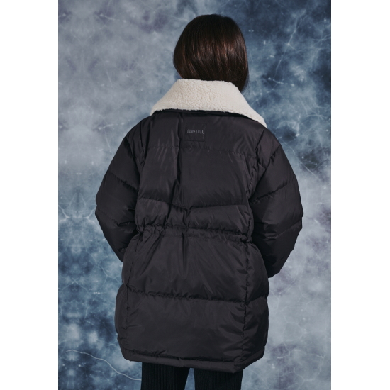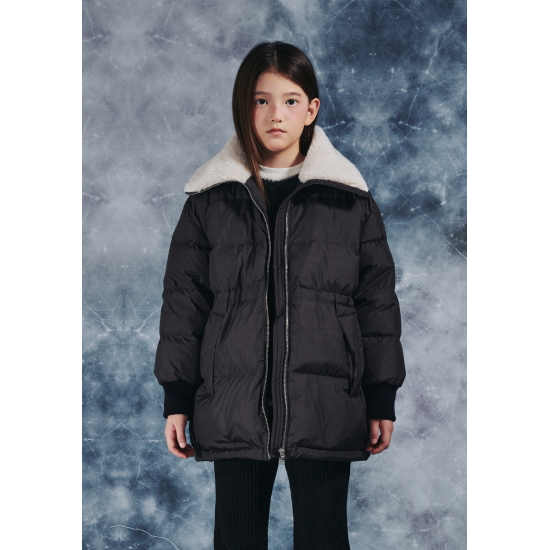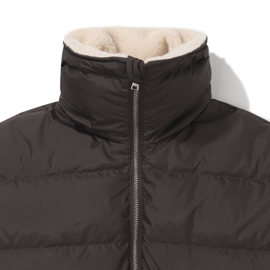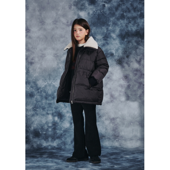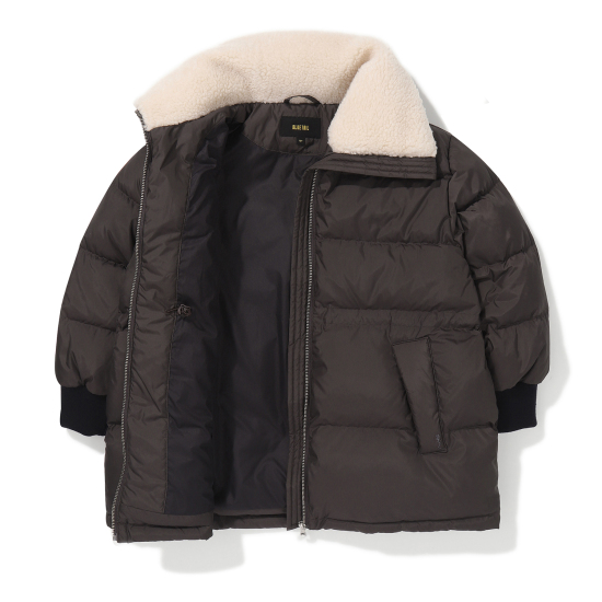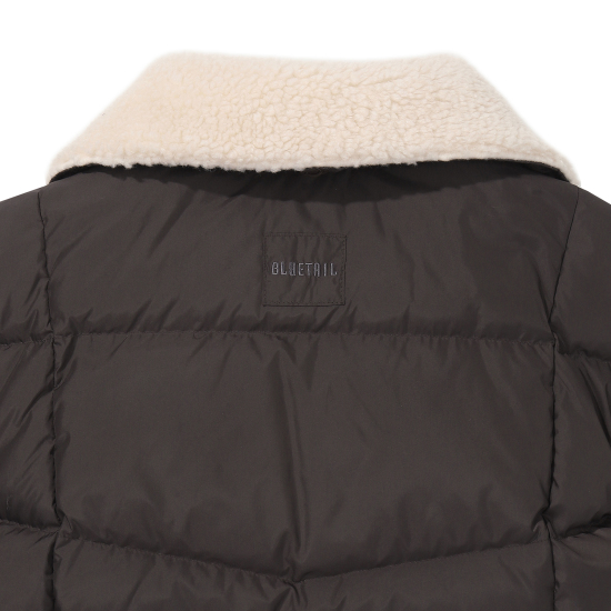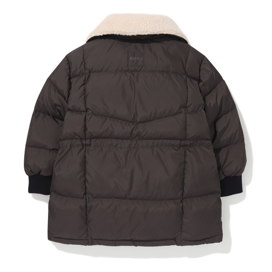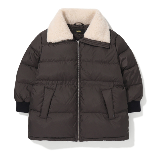 무광의 고급스러운 폴리 소재로 제안한 다크브라운 컬러의 미드기장 다운 점퍼입니다. 오리털(솜털 80,깃털 20)충전대로 보온성이 높으며 가벼운 착용감이 특징입니다. 고시감이 있는 원단 특성상 넓은 칸다운으로 에어리한 볼륨감이 잘 살도록 제안한 상품입니다. 카라 안쪽에 아이보리 보아털 배색으로 코지한 느낌을 연출할 수 있고, 소매는 배색 시보리로 제안하여 스포티한 느낌과 함께 기능성을 주었습니다. 카라 뒷,허리 안,밑단 안쪽에 엘라스트링으로 다양한 연출이 가능하도록 제안했습니다. 도마뱀 자수와 라벨로 컬러 포인트를 주었습니다.