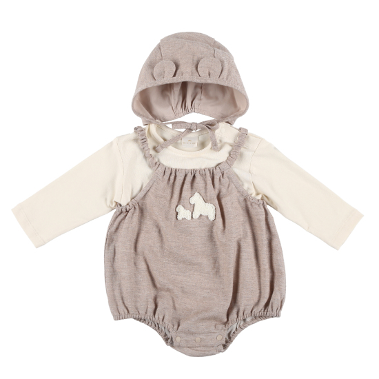 티셔츠와 어깨 끈 밴드의 바디수트& 모자 세트구성인 신생아의류