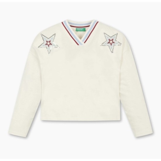 상단에 별 스팽글 장식으로 포인트를 준 캐주얼한 티셔츠.