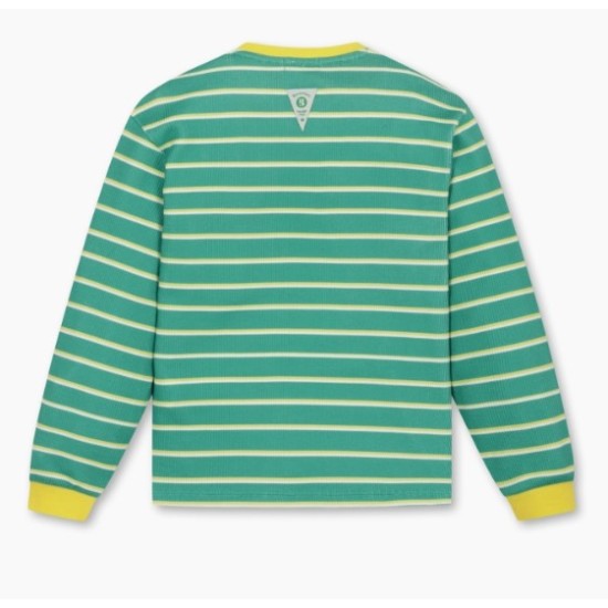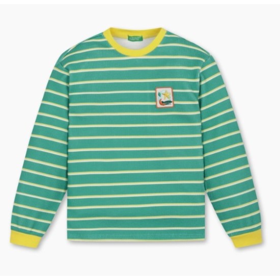 배색 스트라이프가 더해져 컬러감이 돋보이는 티셔츠.