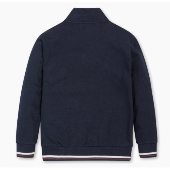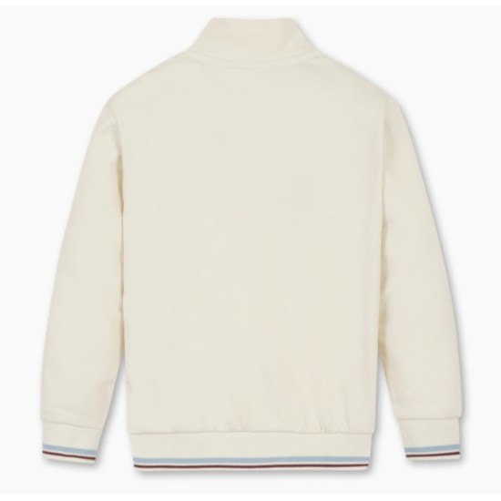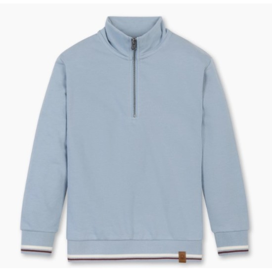 레터링 자수 디테일이 돋보이는 반 집업 디자인의 맨투맨.