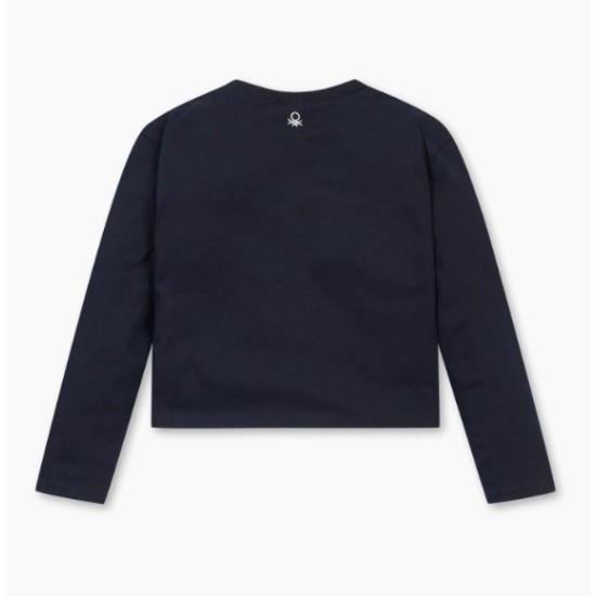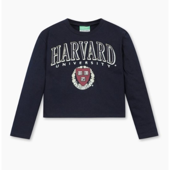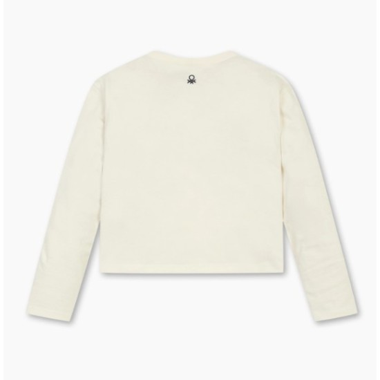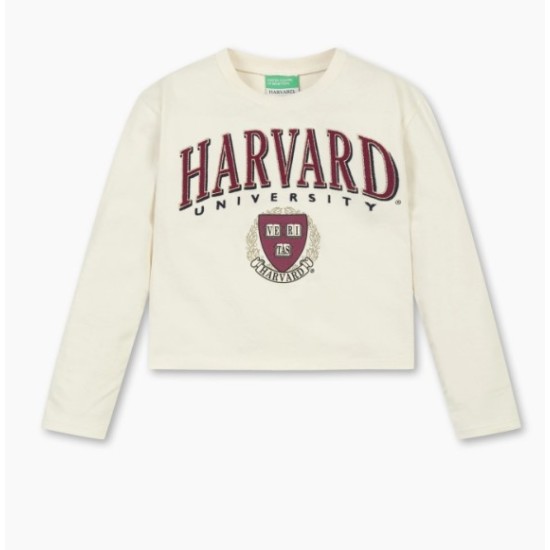 배색 레터링과 프린팅으로 포인트를 준 크롭 기장의 티셔츠.