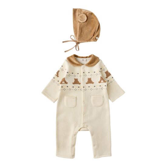 소프트한 크림 컬러의 베베자가드SET우주복입니다. 부드럽고 포근한 면 기모 자가드 소재를 사용하였으며 곰돌이 패턴 자가드로 포인트를 주었습니다. 스판성 있고 부드러운 골 벨로아 소재의 챙 보넷과 세트로 구성하여 귀여움을 더한 아이템입니다.