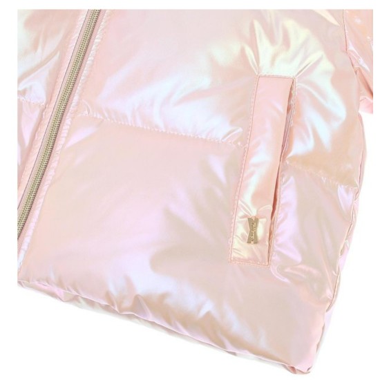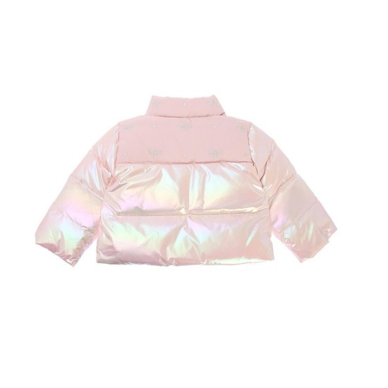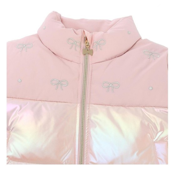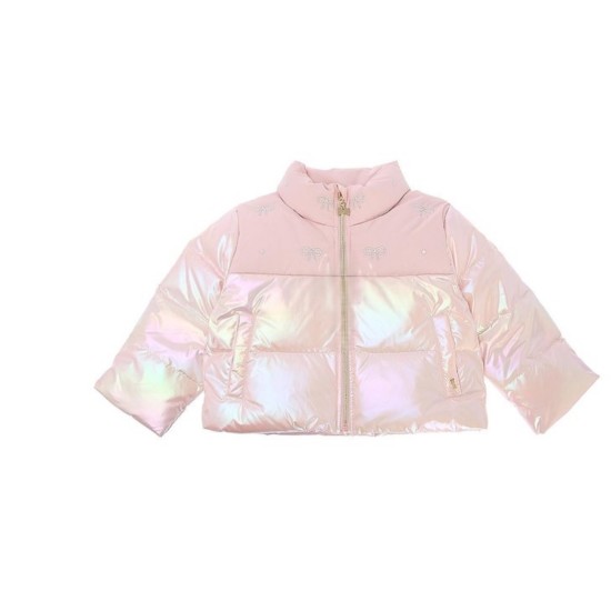 상세설명-톤톤 화섬 원단을 믹스하여 유니크하게 디자인한 핑크 리본 오리털 점퍼입니다.