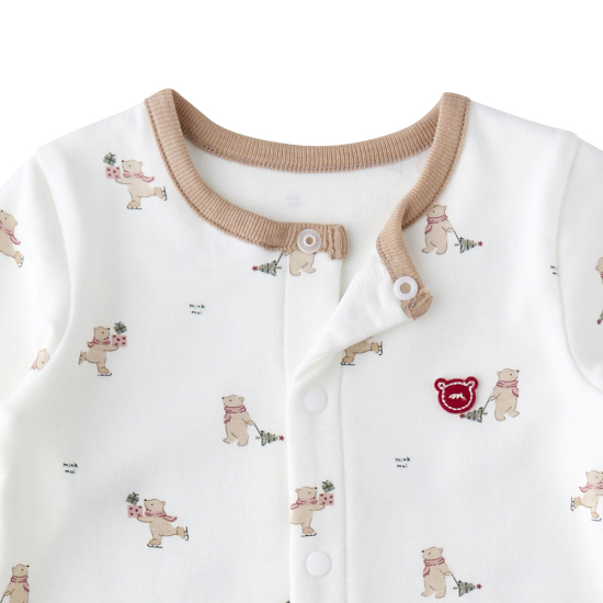 스케이트를 타는 곰 모티브가 들어간 패턴에 밍크뮤 와펜 포인트를 준 디자인으로 출산 선물용으로 좋은 아이템 입니다.