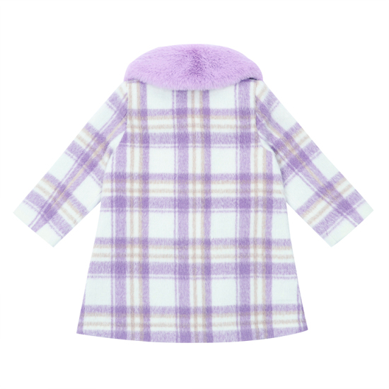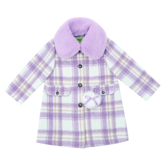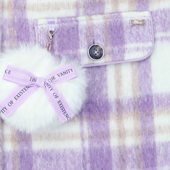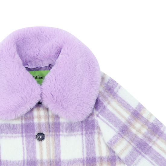 상세설명-은은한 계열의 라일락 체크 소재 코트로 A라인 핏으로 심플한 스타일의 코트입니다. 밝은 라일락 계열의 탈팍 퍼 카라와 아이보리 하트+보라 리본 장 퍼 방울로 포인트를 주었습니다.