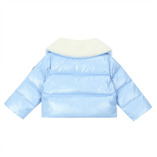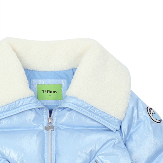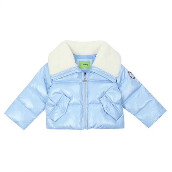 상품설명-샤이닝한 블루 화섬 소재를 사용한 오리털 점퍼입니다. 카라 스타일의 숏기장 점퍼로 카라에 FUR 소재가 따뜻해 보이고,