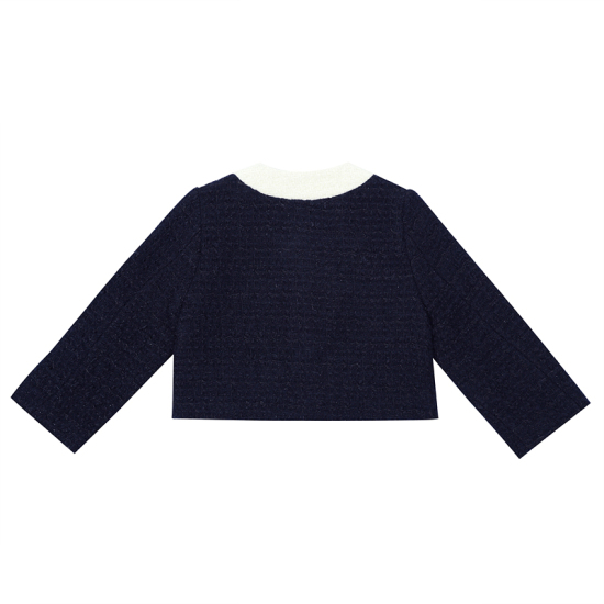 상품설명-네이비 울 소재 자켓으로 은은한 펄감이 고급스러운 스타일입니다. 아이보리 배색을 크게 주어 트렌디함을 살린 스타일입니다. SET 스커트와 코디하여 특별한 날 연출하기 좋은 스타일입니다.
