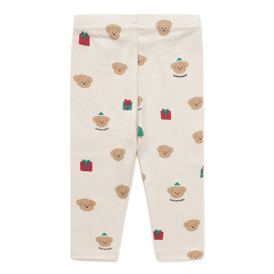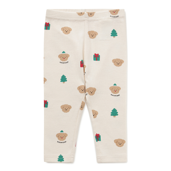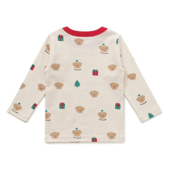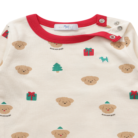 산타 모자를 쓴 도기와 트리 패턴으로 겨울 시즌 등원룩, 크리스마스 이벤트 아이템으로 활용하기 좋습니다.