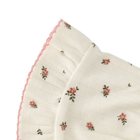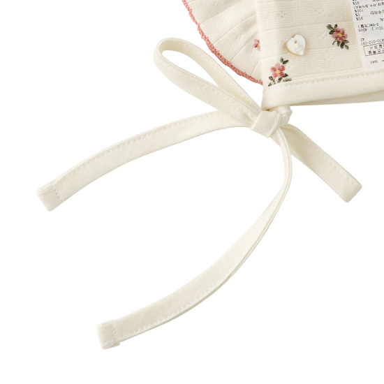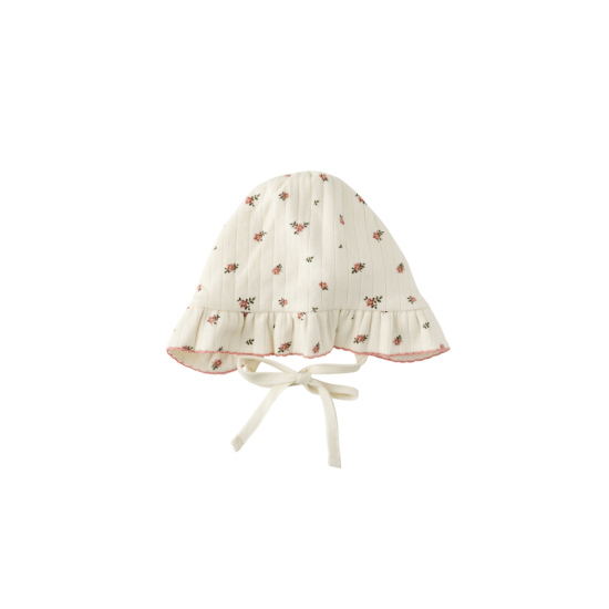아기자기한 플라워 패턴의 원단에 피콧 자수 장식을 더해 화사함을 더한 프릴 모자입니다.