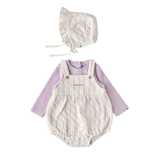 퀼팅지 바디슈트+티셔츠+모자 SET 아이템입니다. 마름모 모양 퀼팅(누빔)속에는 솜이 들어있어 따뜻하고 부드러운 느낌을 줍니다. 스트라이프 나염 바디슈트&모자에 핑크 컬러 티셔츠를 매치하였습니다. 착용하기 편리하여 선물용으로 좋은 아이템입니다.