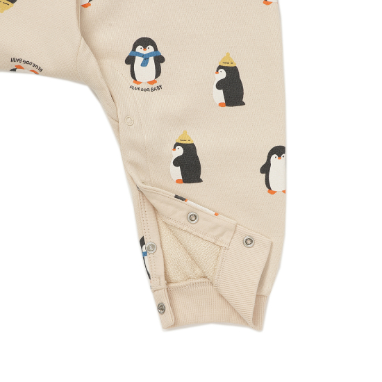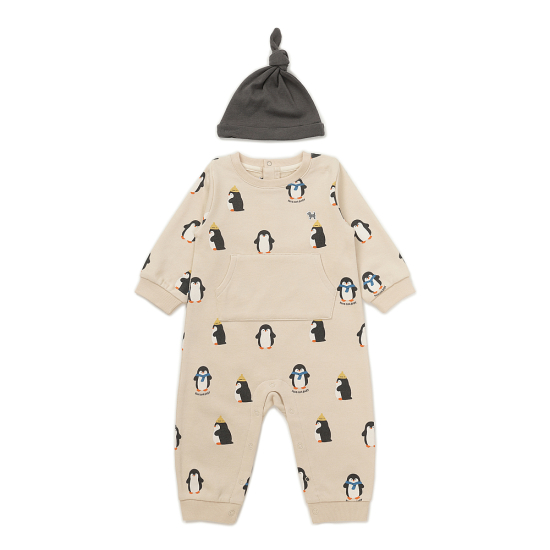 편안한 면소재의 우주복으로 펭귄 전판과 캥거루 포켓이 더해진 우주복과 비니로 구성된 세트형 아이템 입니다.