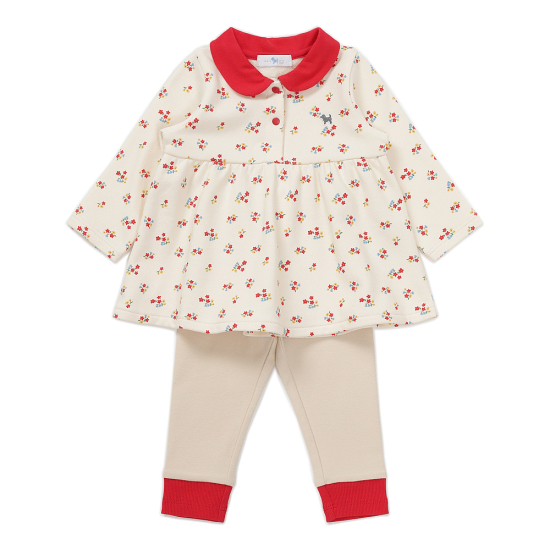 둥근카라, 배색 레깅스로 아이템력을 높였습니다. 잔잔한 플라워 패턴과 레드컬러가 포인트이며