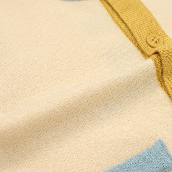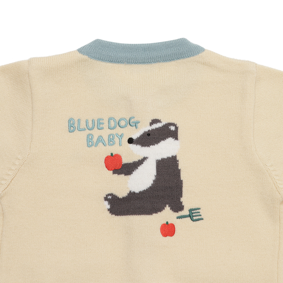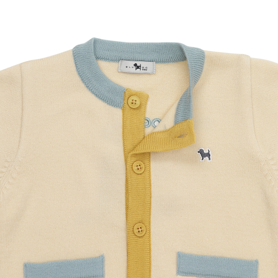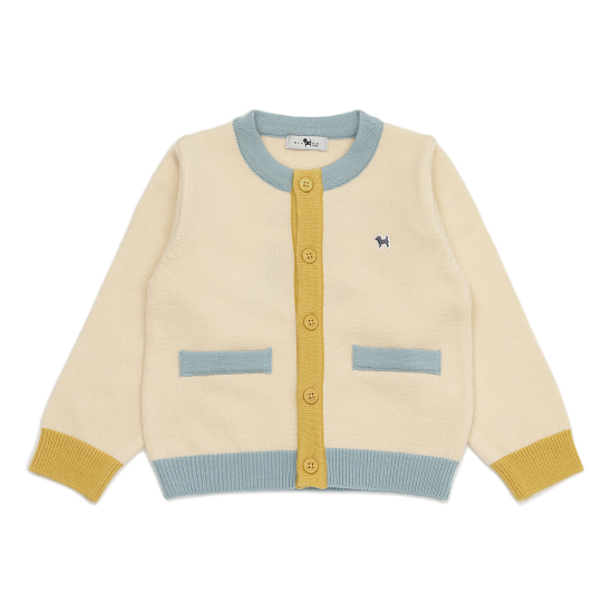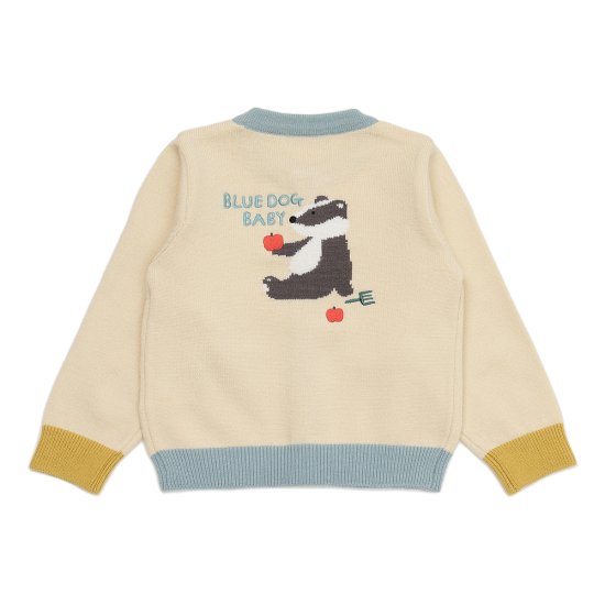 컬러블럭 가디건 입니다. 색감 맥스로 포인트를 주었으며 등판에 귀여운 동물 포인트가 매치되어 있습니다.