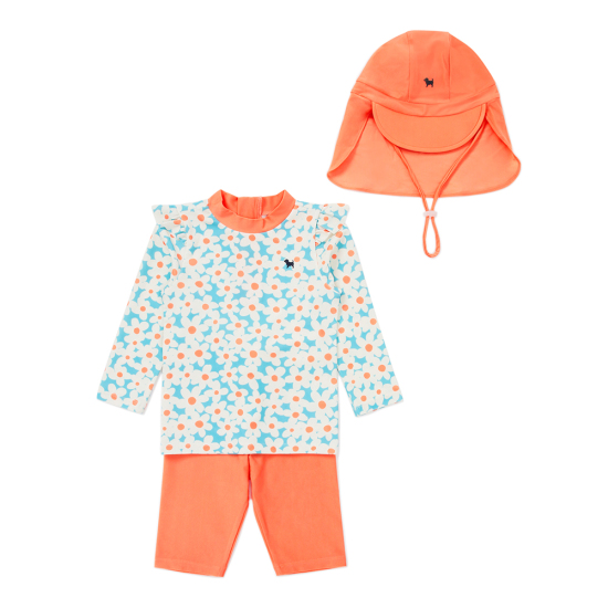 플라워 패턴의 래쉬가드 세트입니다. 뒷지퍼가 있어 입고 벗기에 편리하며, 소매 프릴 장식으로 러블리함을 더해줍니다. 목을 덮어주는 수영모자가 세트 로 구성되어 있습니다. 세탁방법(주의사항)